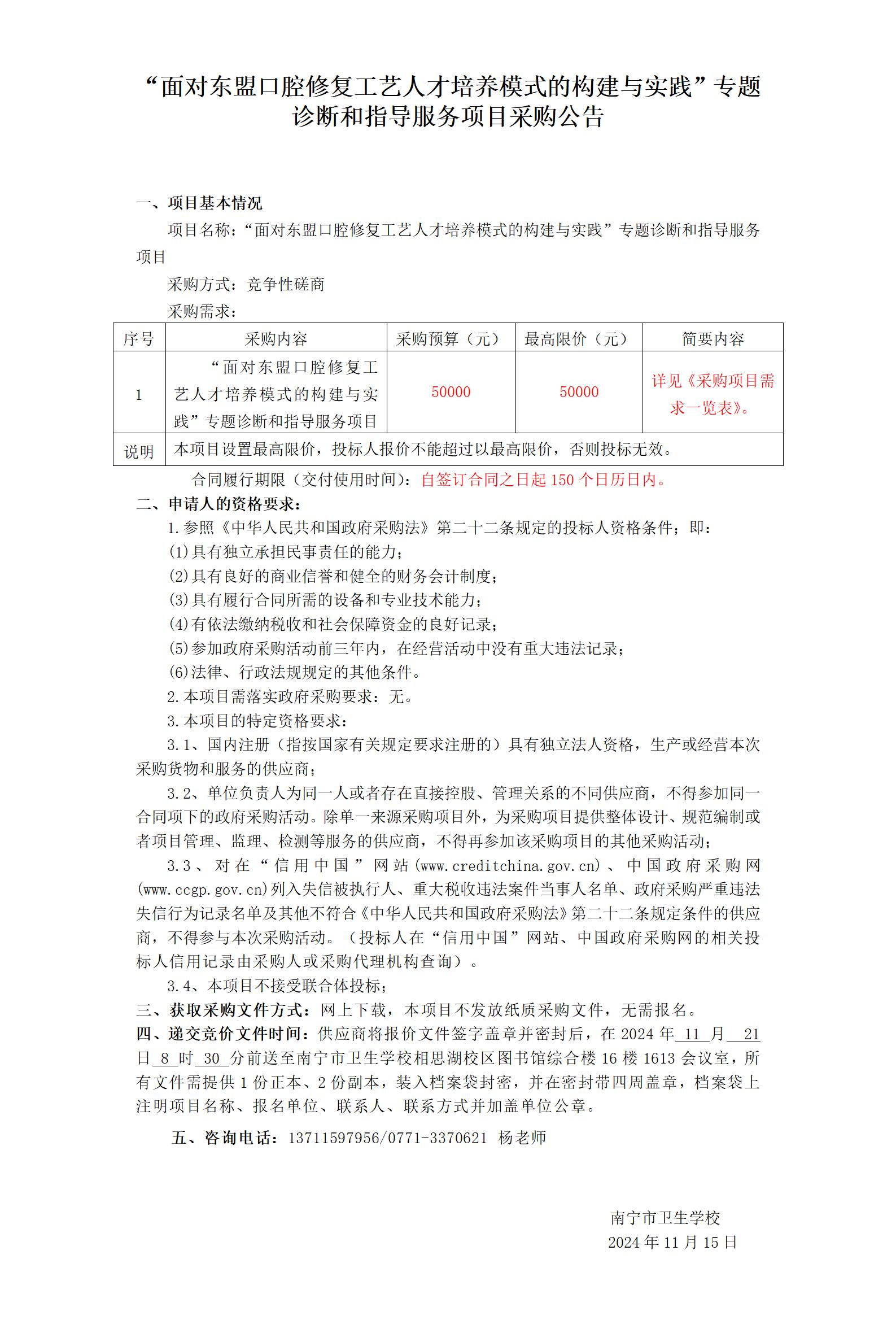 “面对东盟口腔修复工艺人才培养模式的构建与实践”专题诊断和指导服务项目采购公告
