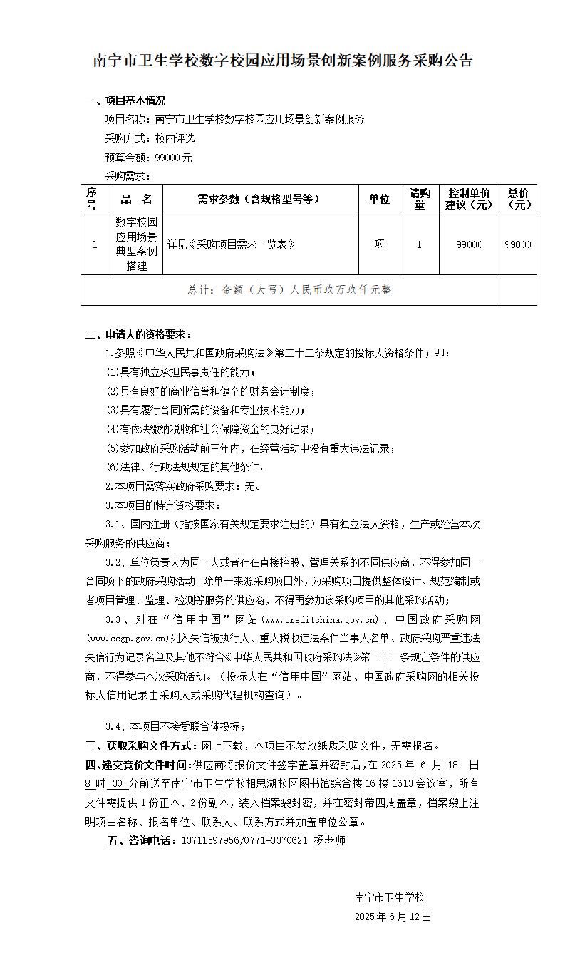 南宁市卫生学校数字校园应用场景创新案例服务采购公告