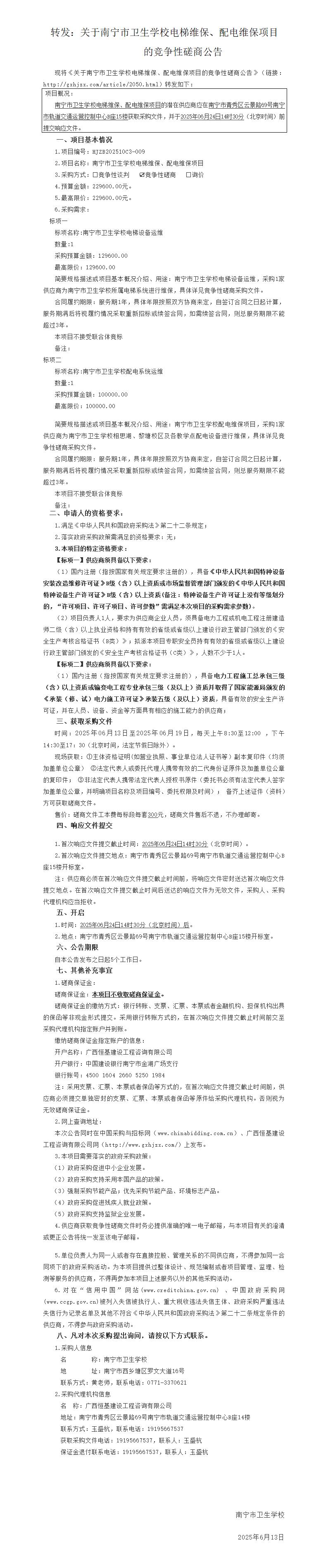 关于南宁市卫生学校电梯维保、配电维保项目的竞争性磋商公告