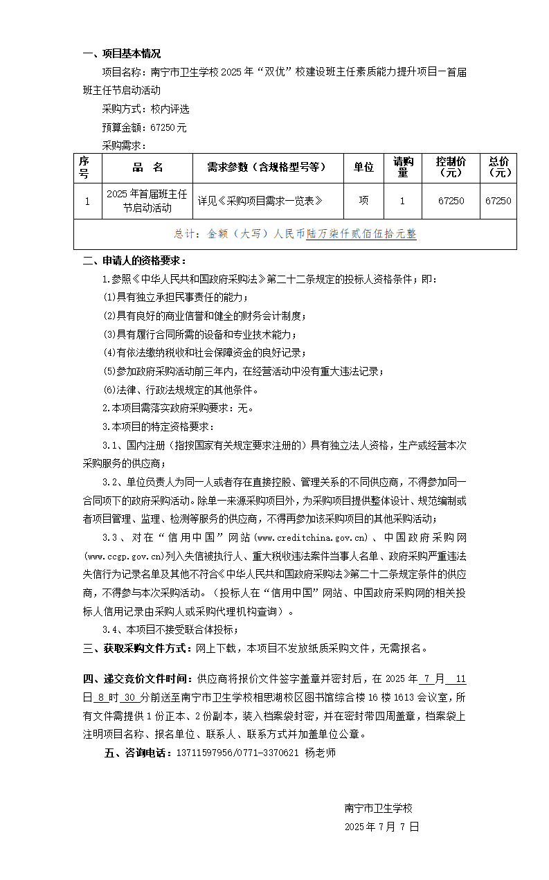 附件:南宁市卫生学校2025年首届班主任节启动活动项目采购文件(1).docx