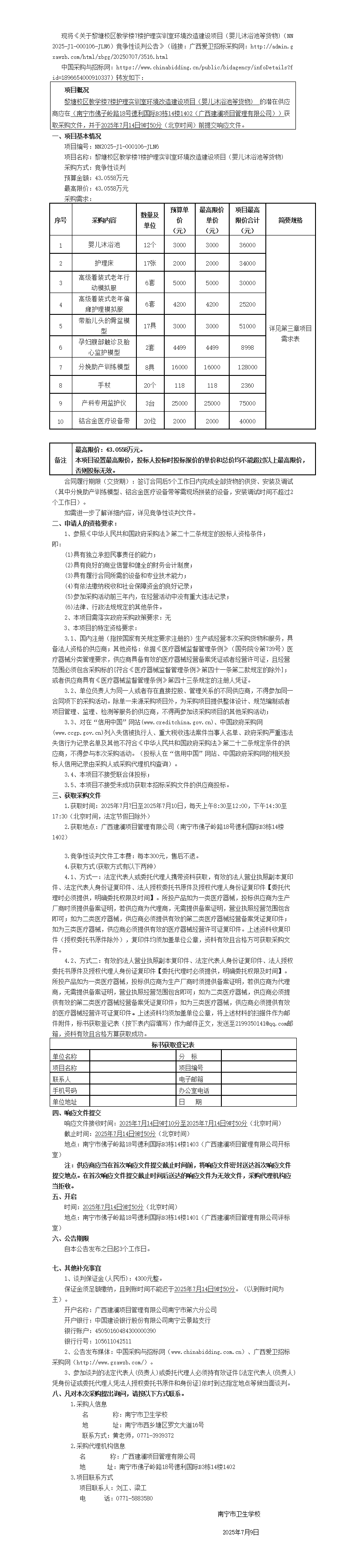 关于黎塘校区教学楼7楼护理实训室环境改造建设项目(婴儿沐浴池等货物)竞争性谈判公告