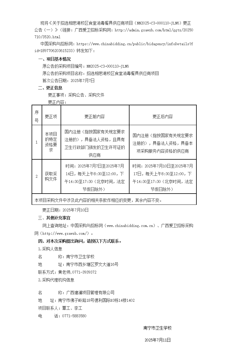 关于招选相思湖校区食堂消毒餐具供应商项目更正公告(一)