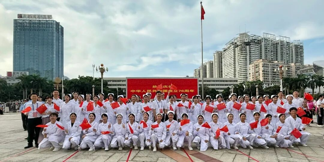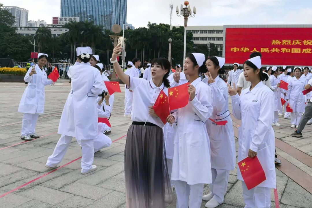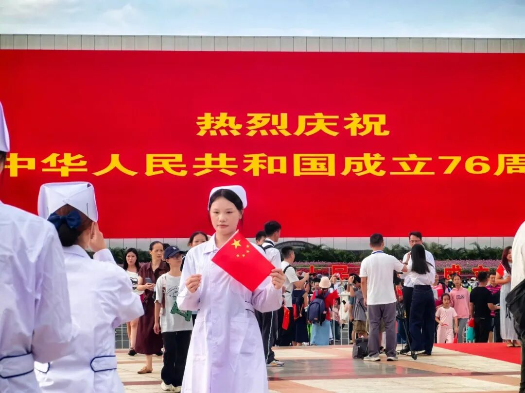 10月1日上午,南宁市庆祝中华人民共和国成立76周年升国旗仪式活动在民族广场举行。南宁市卫生学校组织55名师生代表加入南宁市卫生健康委员会方阵观礼升国旗仪式,共同见证这个庄严的时刻。